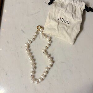 Classic Pearl necklace by Eliou with Large White Pearls and blue knots in between. Will include storage bag