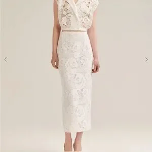 This elegant white lace skirt is perfect for any occasion. Its intricate design adds a touch of sophistication to your wardrobe. Never worn. Tags still on.