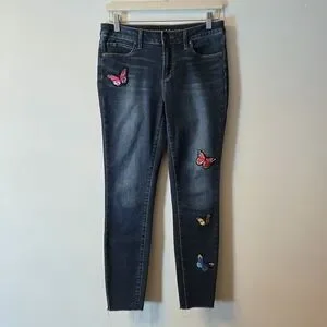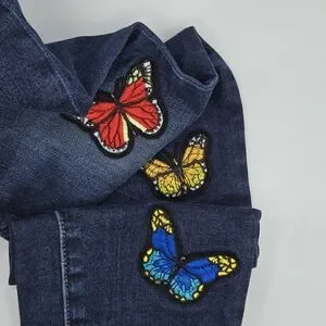 Features: Embroidered butterfly patches, stretchy comfortable fit, fringed raw hem, mid-rise skinny leg