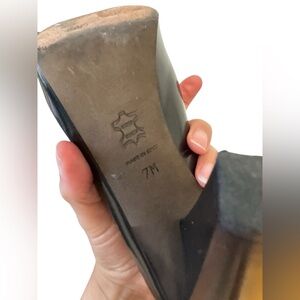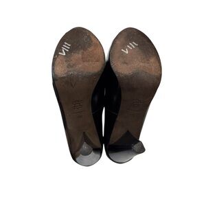 Donald J Pliner heels. Black in color. Patent leather. Peep toe. Platforms. Cone shaped high heel. Made in Italy. Size 7
