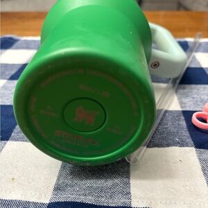 Stanley travel mug in green with a handle. Perfect for on-the-go use.