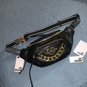 Love Moschino PU Leather Gold Tone Heart Chain Fanny Pack.