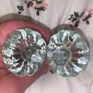 - 2 smaller clear glass STAR& bronze metal knobs. 1 bolt is missing to the screw of 1 knob (see pics) otherwise in excellent condition.