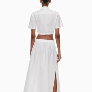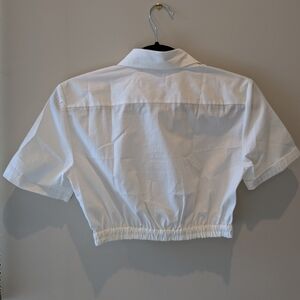 Super cute short sleeve button-up blouse that is cropped with an elastic hem. Gorgeous material is an airy, crisp cotton poplin that is lightweight.