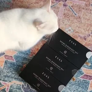 Explore the ESAS Scent Discovery Sets. Elegant black packaging. All natural scents, great way to try the brand. Listing is for all three, kitty not included. On the website these retail for $100 all together. I've sprayed most (but not all) of the samples 1, max 2 times, so price reflects that. Great way to try everything at 40% off. These smell very fresh and somehow much less precise or saturated compared to typical perfumery. Ordered them about 6 months ago and stored them in cool, dark places to preserve scent integrity.