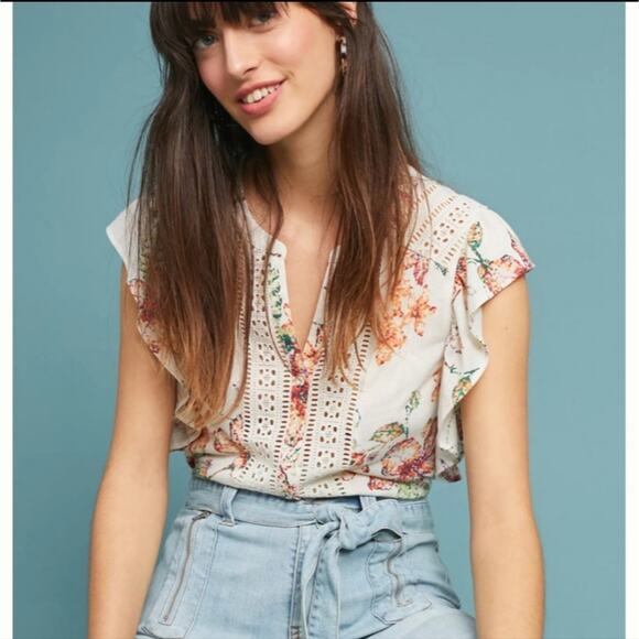 Anthropologie Maeve Floral Eyelet V Neck Short Sleeve Linen Blend Top Size XSP