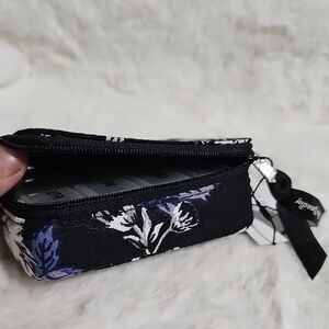 New! Vera Bradley pill case in Merry Mischief with a bold floral pattern in black, blue, and lavender. Features a secure zip closure. Ideal for travel. Designed to organize medications and vitamins. The case contains a clear removable compartment labeled for each day of the week.