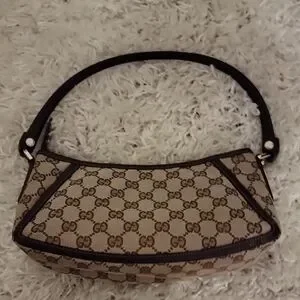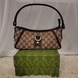 Authentic Gucci D Ring Abbey shoulder bag in beige and brown GG canvas. Features a sleek design with a sturdy handle. Excellent condition.