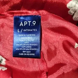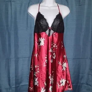 women's sleepwear / silky red mini length chemise gown with black and white flowers / size Large / has black lace breast design / nightgown is in excellent condition / **same item as stock photo**
