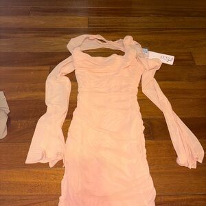 Chic blush dress with long sleeves. Features a stylish cut-out design. Perfect for elegant occasions.