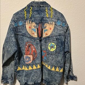 This vintage denim jacket features vibrant colorful accents, perfect for adding a unique touch to your wardrobe. The classic blue denim is complemented by eye-catching patterns, making it a standout piece.