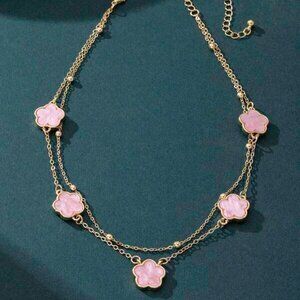 A graceful double-layer chain adorned with five pink clover charms in gold trim. Crafted in 14K gold filled finish with an adjustable 14.6" + 2.8" chain, each charm measures approx. 0.75" by 0.6". Delicate and refined, this piece adds a touch of color and elegance to any look.