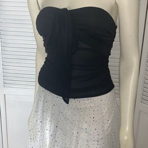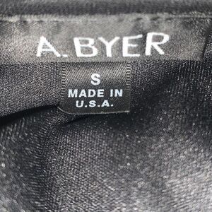 A. BYER made in the USA. Black stretchy pullover strapless double layered chiffon rushed large bow front bodice. Double layered sheer chiffon tulle asymmetrical skirt iridescent reflective sequins. Great vintage condition. Hand Wash. Size small. Please see measurements below.