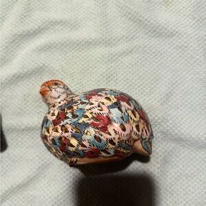 The product is a vintage pair of handmade ceramic quail figurines, featuring intricate handpainted details and a painted finish. The quail are beautifully crafted from porcelain and ceramic, with vibrant multi-color accents that add to their charm. These unique vintage pieces would make a lovely addition to any bird-themed collection or decorative display, showcasing the artistry and craftsmanship of Asian ceramic painting