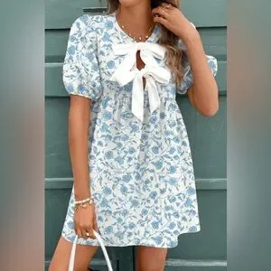 Chic and stylish, this floral dress features a beautiful blue and white pattern. The elegant bow detail adds a touch of sophistication. Perfect for any occasion.