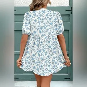 Floral Blue and White Dress with Bow