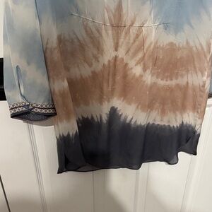 Elegant tunic with a tie-dye pattern. Features shades of blue and brown. Ideal for casual wear.