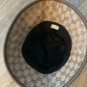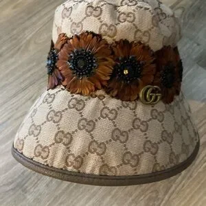 Elegant reworked redone GG bucket hat with feathered embellishments. Signature pattern. Ideal for stylish outings and making an impression !