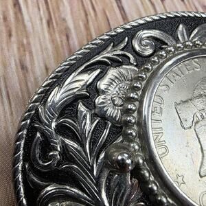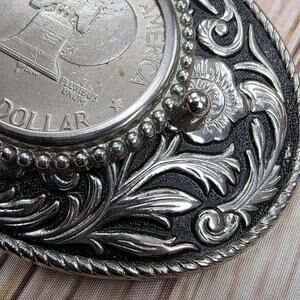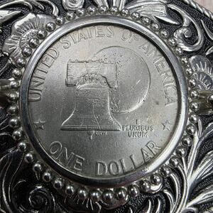 Features an authentic Eisenhower one dollar coin centerpiece with Liberty Bell and moon design, surrounded by ornate Western-style silver floral scrollwork and beaded accents.