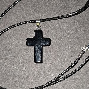 Obsidian Chakra cross pendant on 18" black leather necklace with 2 " silver extension. Obsidian Chakra dispels negative energy and is a protection stone