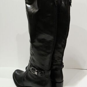 1 *Has 2 Small Holes on Bottom from Display* New Pair No Box By Via Spiga BLACK LEATHER Boot with Charcoal Harness and Upper Inner Stretch Knee High Zipper Riding 7.5 M New (Box #22)