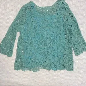 This elegant lace blouse in a beautiful teal shade adds a touch of sophistication to any wardrobe. Perfect for both casual and formal occasions.