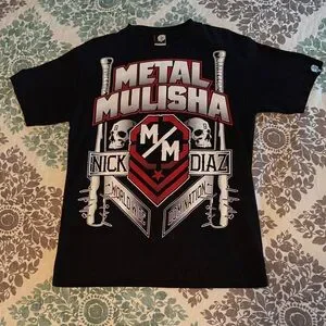 Bold Nick Diaz Metal Mulisha tee with striking red and white graphics. Features skulls and text design.