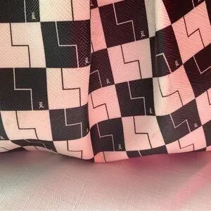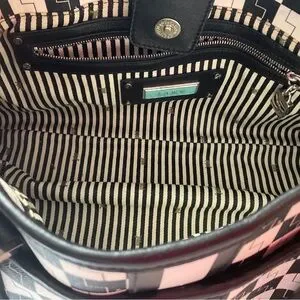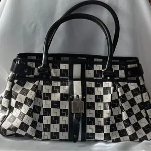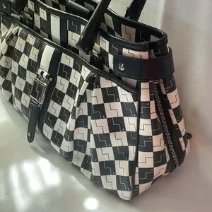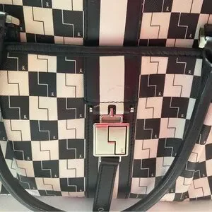This L.A.M.B. satchel features a striking black and white checkered pattern, offering a bold and modern look. Crafted with structured elegance, it combines style and functionality, making it an ideal accessory for any occasion.