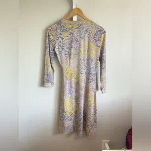 Chic dress with abstract patterns. Features blue, pink, and yellow tones.