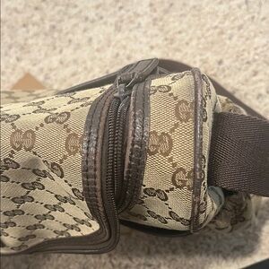 Stylish Gucci baby bag with signature GG pattern. Beige and brown tones. Perfect for parents on the go.