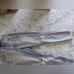 Light blue GAP skinny ripped jeans with frayed hems. Ripped at the knees and thighs. Frayed at the bottom of legs. Very cute style.