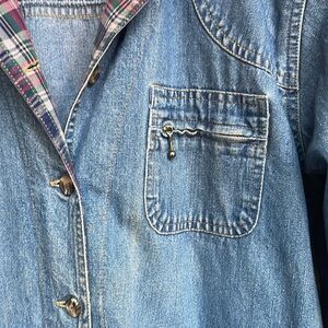 Comfy denim jacket with plaid accents. Features button closure with 2 Large open pockets and adorable upper pocket with zipper. Perfect for cozy fall weather.