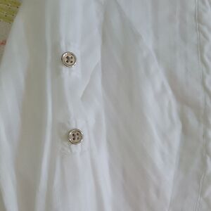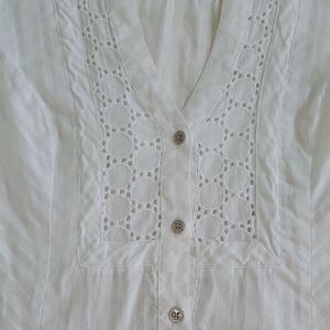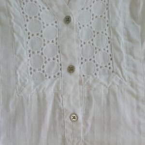 Chic white blouse featuring eyelet accents. Long sleeves with button cuffs. Perfect for versatile styling.