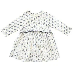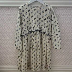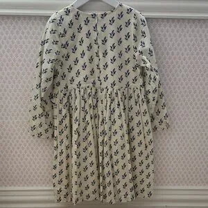Adorable dress with a floral print. Cream background with blue flowers. Features a charming ruffle detail.