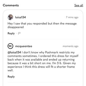 @luisa134 I don’t know why Poshmark restricts my comments sometimes. I ordered this dress for myself back when it was available and ended up returning because it was a bit short on me. I’m 5’6. Given my experience I think this dress will fit a shorter frame well.