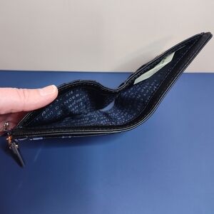 This kate spade wallet showcases a sophisticated black base adorned with a striking blue floral design. Crafted from high-quality materials, it offers both style and durability. The elegant floral motif adds a touch of charm to your everyday essentials.