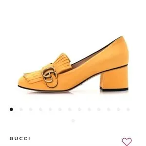 GUCCI Kid Scamosciato GG Marmont Fringe 50mm Loafer Pumps size 39 in Crystal Copper. These bold loafers are crafted of soft suede kidskin leather in yellow. They feature a fringe detail at the tongue with an antique gold GG logo, a rounded toe and a 2 inch heel. Some light scuffing/dark marks pictured, otherwise in great shape. Priced accordingly. Box/dusters included.