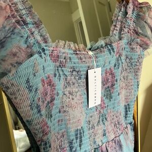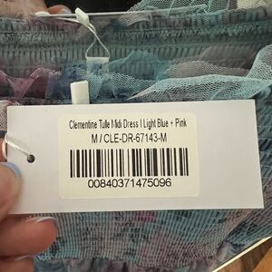 Charming midi dress with floral pattern. Features a blend of blue and pink. Ideal for any occasion. SOLD OUT on website!