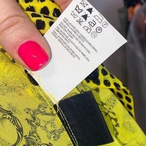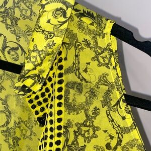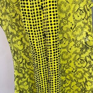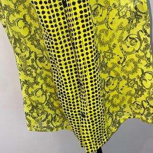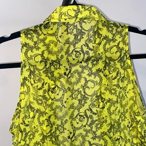 Bold Versace blouse in neon yellow with intricate black patterns. Sleeveless design for a chic look. Excellent condition