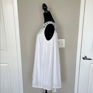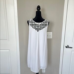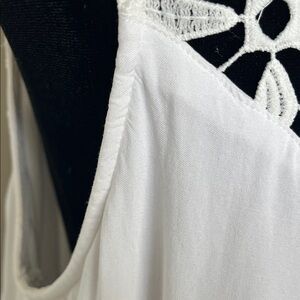 Elegant white mini dress. Features intricate lace detailing. Sleeveless design. Perfect for summer occasions. EASY, BREEZY, BEAUTIFUL!!! Chic ivory dress with intricate lace design. Ideal for stylish outings.