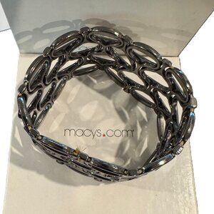 Make a bold impression with this black chrome cuff bracelet featuring an openwork oval design and stretch elastic fit. Its high-shine finish and sculptural silhouette bring a modern edge to any outfit. Lightweight and flexible, it’s perfect for stacking or wearing solo as a statement piece.