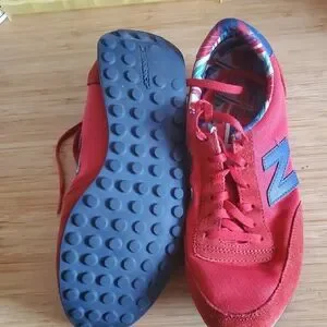 Bright red sneakers with navy accents. Ideal for active women. Durable and stylish, gently used still a lot of life left. add them to your closet amd enjoy!
