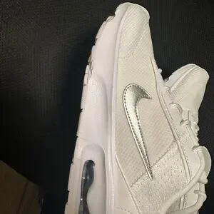 Elevate your look with these Nike sneakers. Crisp white with a striking silver swoosh. Ideal for everyday wear.