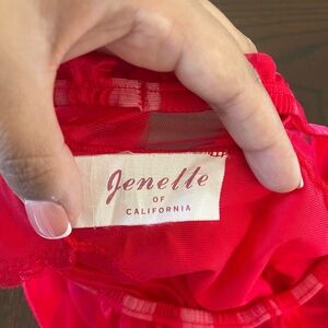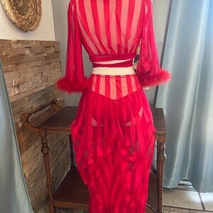 Chic red sheer lingerie set by Jenelle. Features elegant feather trim for a bold look. #romantic #sexy #gipsy