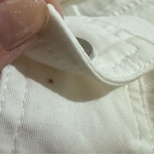 Please note colored mark on left sleeve, not visible when rolled or buttoned and also little mark in middle of back of jacket. I have not tried to wash as tags are on item. Please see photos