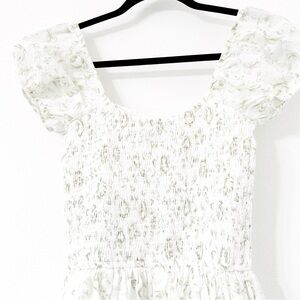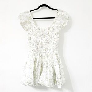 Hollister mini dress Petite Small. White with green floral print. Puff sleeves, tie front, smocked sides + back, flowy skirt. Romantic cottagecore style. Lightweight, feminine, easy fit. Perfect for spring, summer, brunch, or casual wear. Excellent condition.
