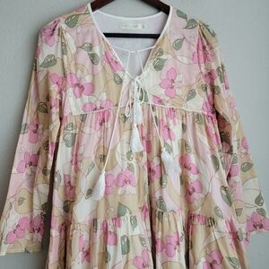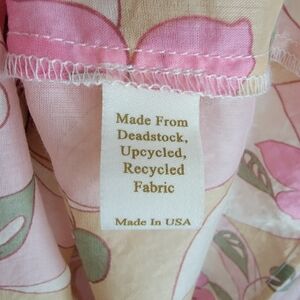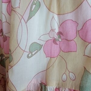 Lightweight cream, tan, green and pink floral deadstock fabric, feels like rayon
