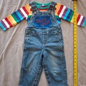 This is a DIY outfit I made for my son a couple years ago! The overalls are Osh-Kosh Size 18mos. He happens to have blonde hair so you might need to supplement with a wig, and there are play knives, of course, at the Halloween store! We had so much fun with this one! Paired it with some red velcro sneaks from Amazon and it was a total hit!