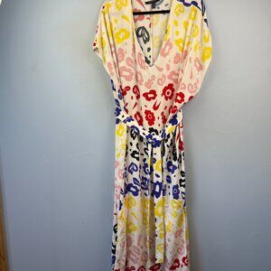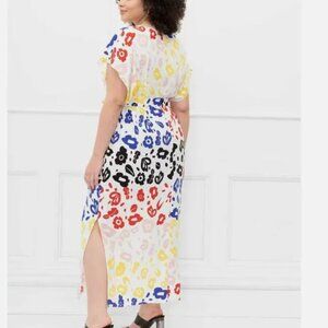 Vibrant floral print. Short sleeves. Flowy silhouette. Perfect for any occasion.