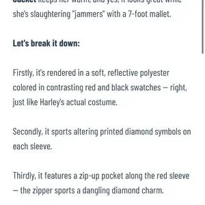 Firstly, it's rendered in a soft, reflective polyester colored in contrasting red and black swatches -- right, just like Harley's actual costume.